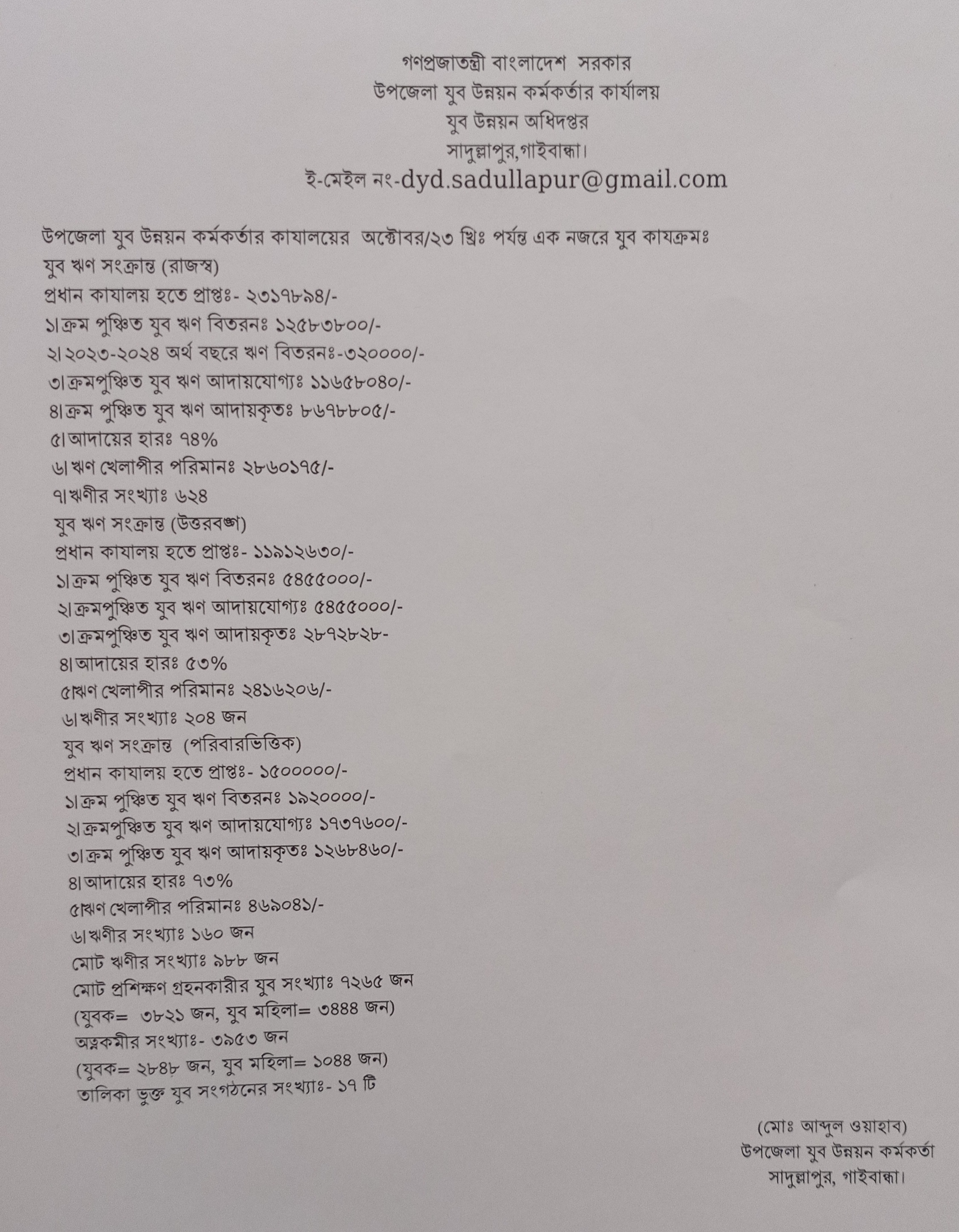 যুব কার্যক্রম:১।যুব প্রশিক্ষণ ২।আত্মকর্মসংস্থন ৩।যুব লোন ৪।যুব সংগঠন ৫।ন্যাশনাল সার্ভিস কর্মসূচি